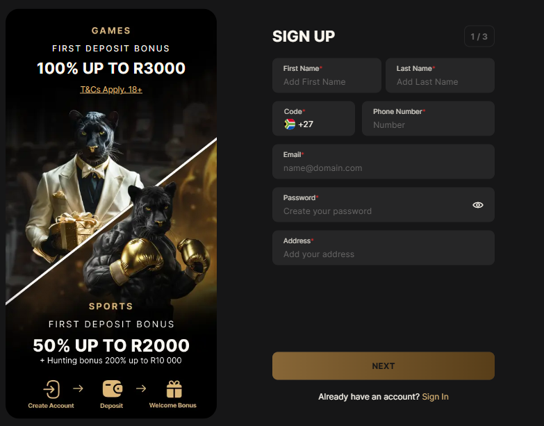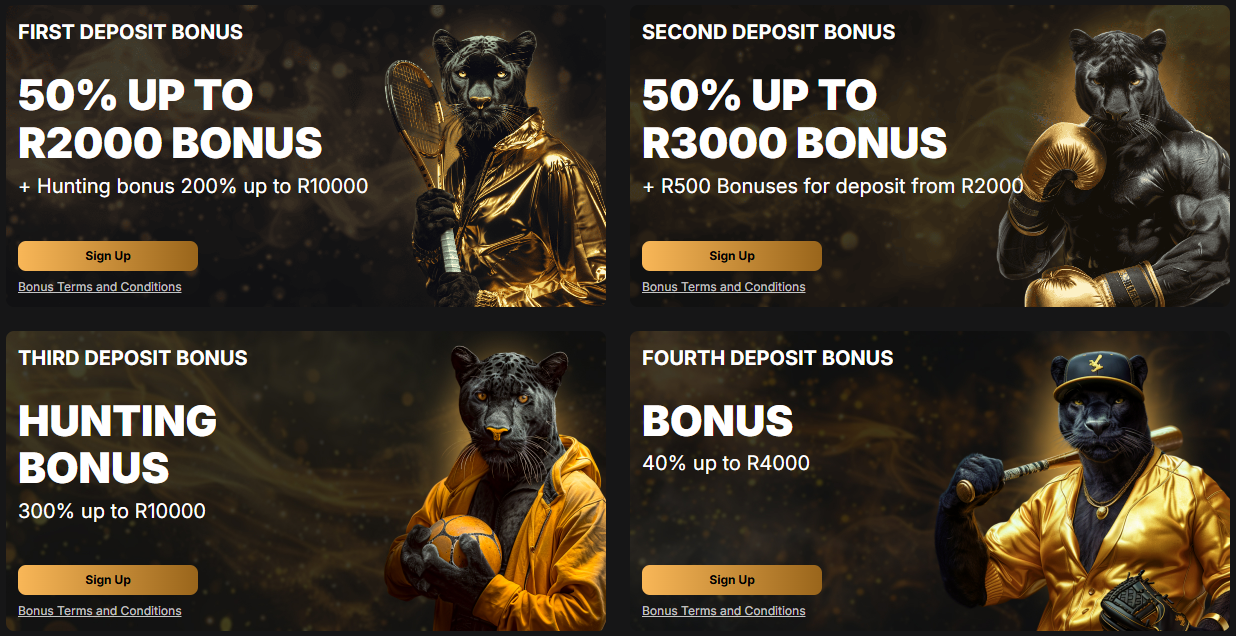 Sign up on PantherBet, enter the promo code "BETS," make a deposit of at least R10, and you'll receive a 100% bonus up to R2,000 for sports or R3,000 for casino.