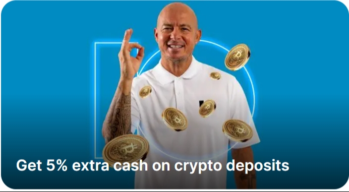 The offer gives you an additional 5% on your crypto deposits when funding your account using BTC, ETH, LTC, USDT, USDC and more.